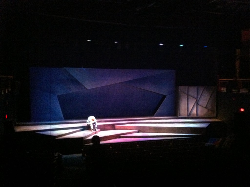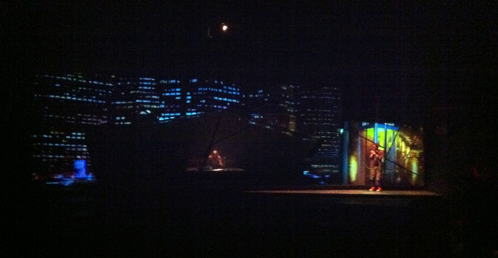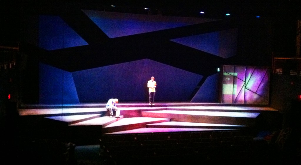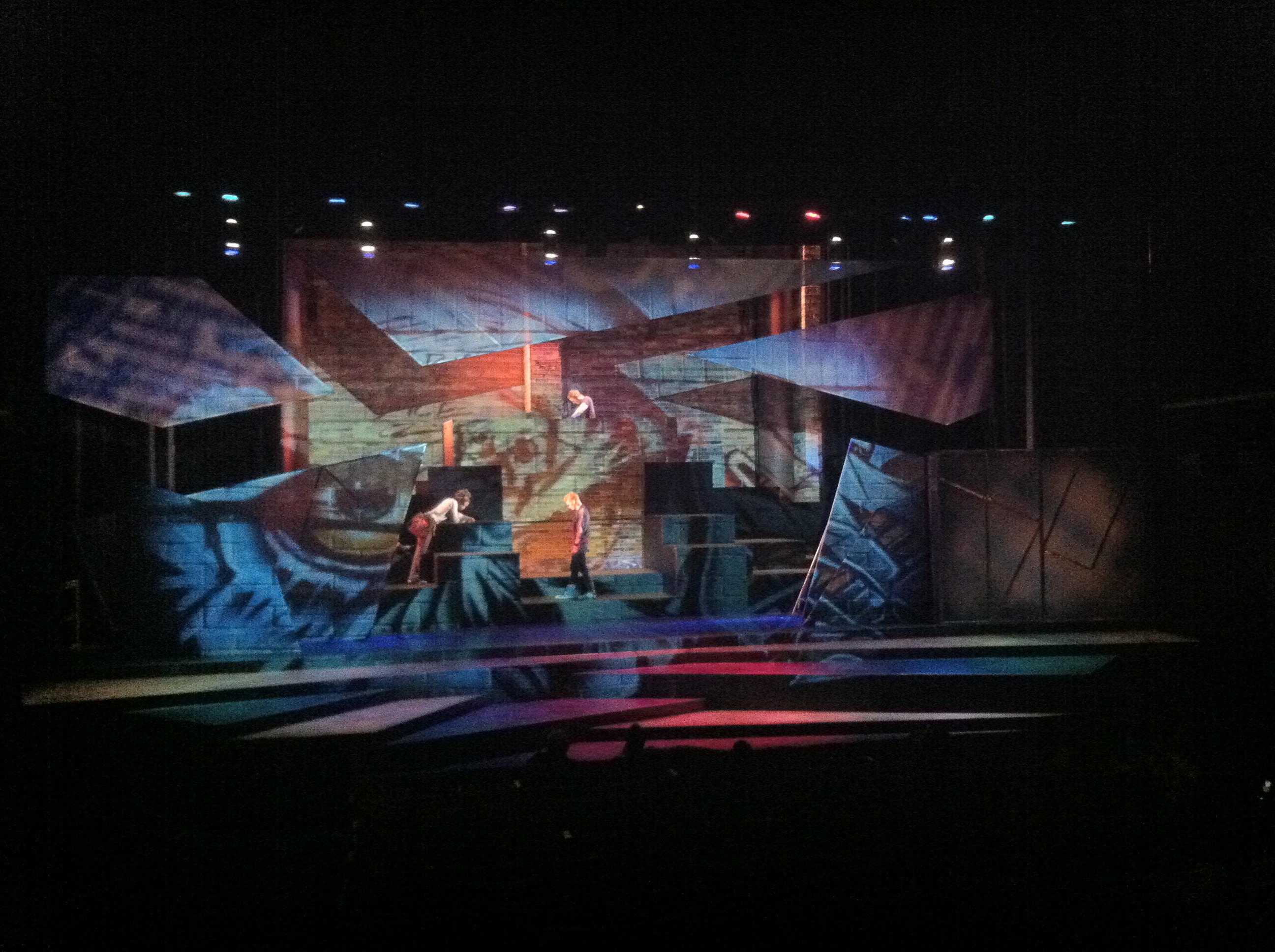 Andy Moro has designed a fairly abstract set with a long pentagonal opening that only takes on any identity under the fantastic still and moving projections he has designed. His animation of the words flying about Trey’s head as he tries to give his speech is a great effect and the outer space projections he uses to show Jude’s preoccupations are stunning.
