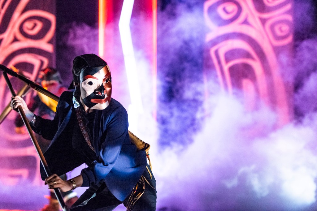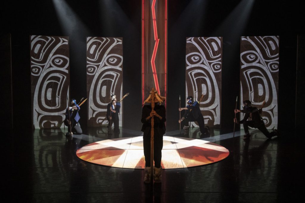 Through integrating narrative, movement, song, performance, and new multimedia design, Mînowin connects landscapes and Coastal form line with contemporary perspectives of customary Indigenous dance forms. The Dancers of Damelahamid draw from origin stories and explore ways to translate these perspectives through a contemporary lens.