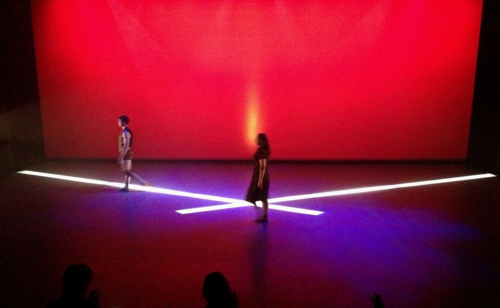 IDR Artistic Director Sandra Laronde with Taane Mete (Aotearoa). Performance footage featuring lighting by Andy Moro.